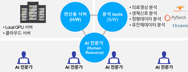 우리 연구실은 다양한 미충족 의료 수요 해결을 위한 AI 연구를 활성화하고 조기 성과 달성을 위해 AI 연구 플랫폼을 구축하고 있습니다. H/W, S/W, 및 Human Resource로 구성된 AI 연구 플랫폼을 통해서 실용적 연구결과를 창출하고 이를 기반으로 연구과제 수주, 기술이전 등 다양한 재원을 마련하여 플랫폼에 재투자 및 지속 성장하는 선순환 구조를 지향합니다.