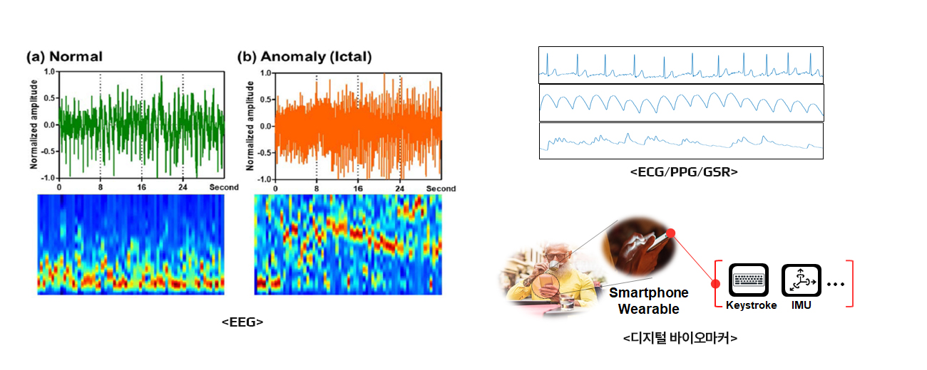 생체신호/디지털 바이오마커 분석 EEG, ECG, PPG 등의 전통적인 생체신호 뿐만 아니라, 웨어러블/스마트폰 데이터를 분석하여 뇌전증 등의 질환을 분석하거나 스트레스/우울증 등의 정신건강 관련 지표 분석